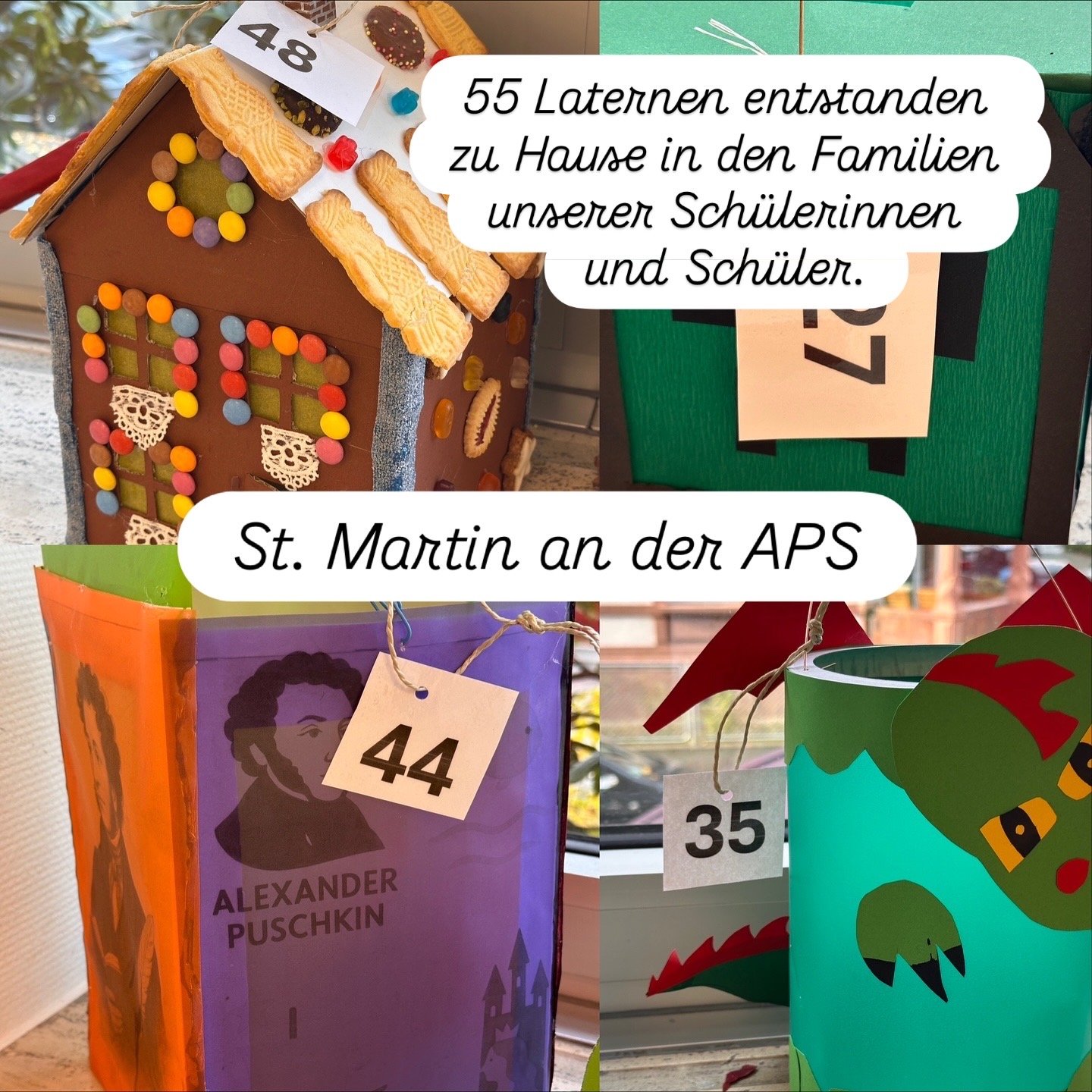 In den Tagen vor St. Martin verwandelten sich zu Hause viele Küchen und Wohnzimmer in kleine Werkstätten. Familien bastelten mit viel Geduld und Fantasie mehr als fünfundvierzig Laternen, jede mit einer eigenen Idee und einer eigenen Handschrift. Die fertigen Laternen standen und hingen anschließend im Foyer. Viele Kinder, Eltern und Lehrkräfte nutzten die Gelegenheit, sie sich in Ruhe anzusehen. In der Woche vor dem Fest durfte die ganze Schule abstimmen. Am Festtag freuten sich die Kinder mit den beliebtesten Laternen über ihre Auszeichnung.